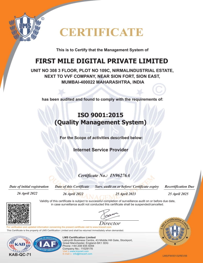 Leased line services by First Mile is very good, all our office applications are running very smoothly, Most important point to mention is their services, just one call away. Thank you First Mile.